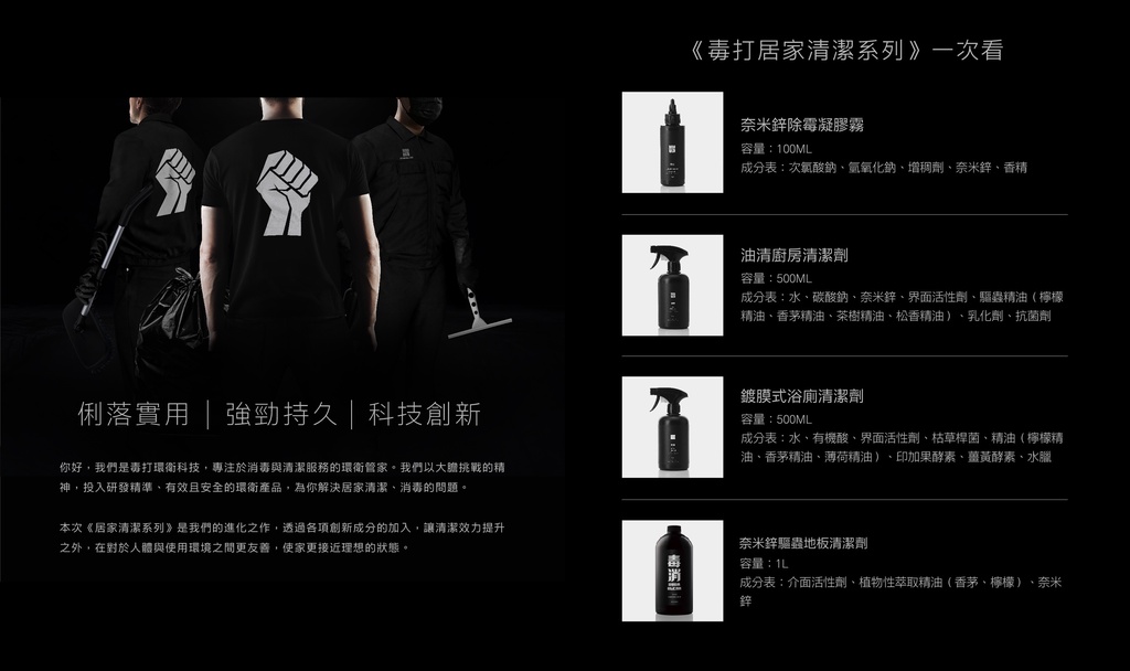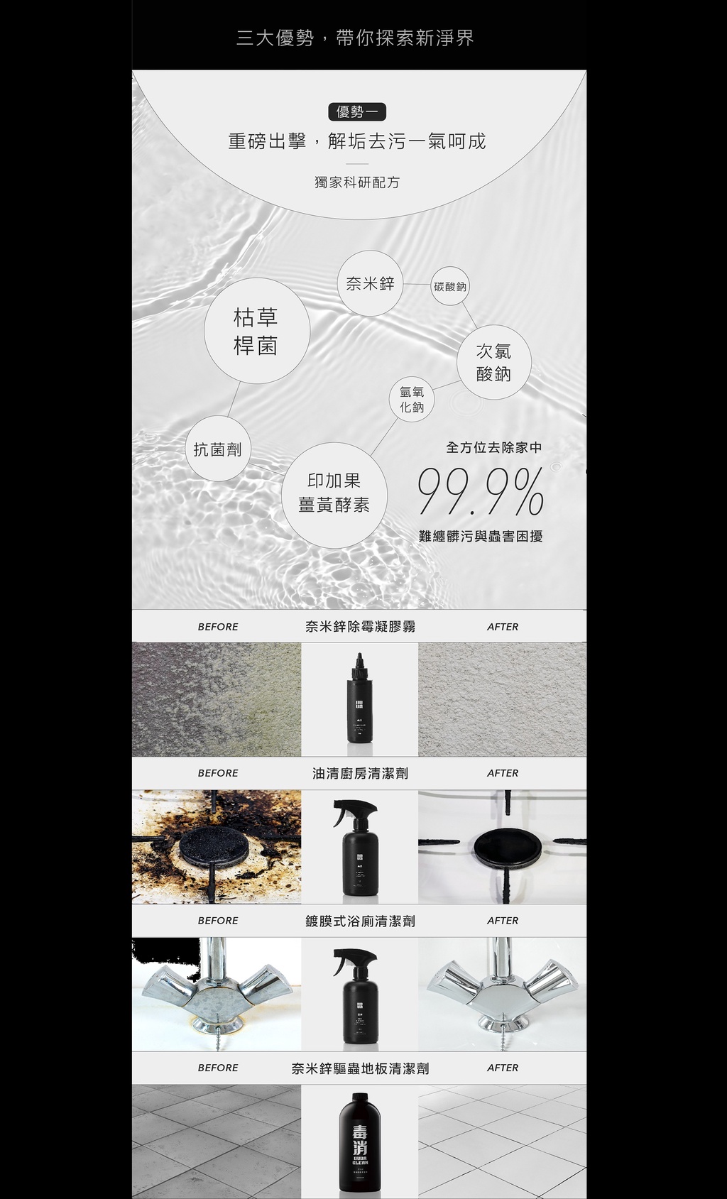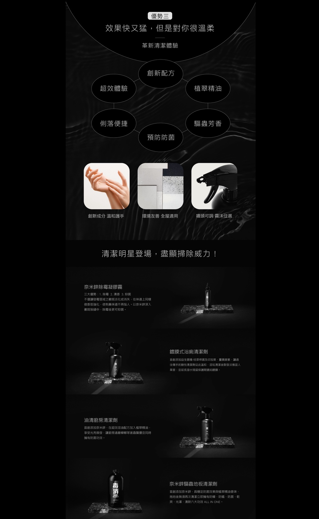 台灣首款將醫療大廠主力抗菌成份「奈米鋅」加入清潔劑,在潔淨力十足的除油清潔劑內加入奈米鋅與驅蟲精油,可達「超潔淨」、「遠離蟲害」、「安心防菌」三大保護