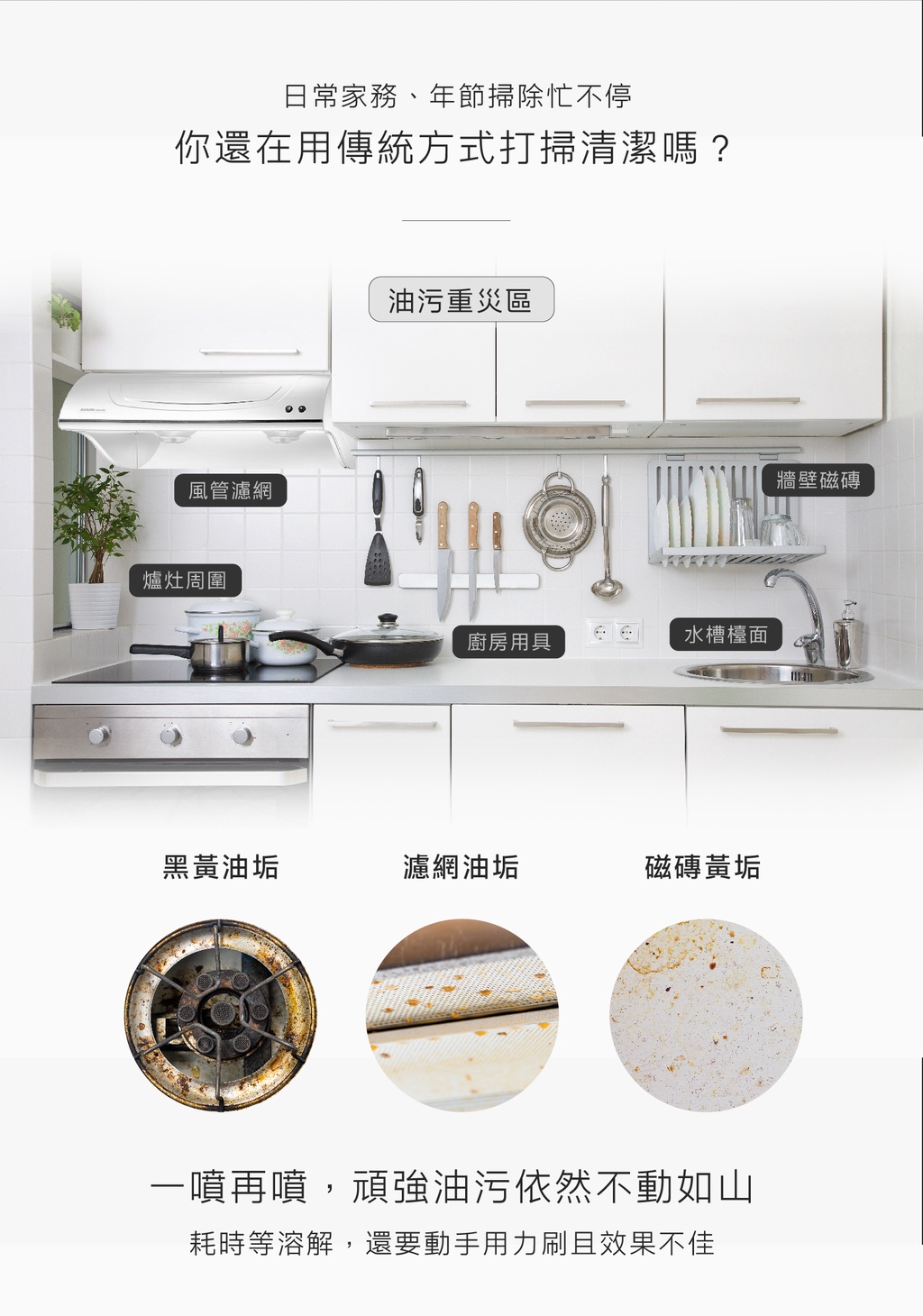 於清潔目標區域噴霧,待5-10分鐘即可以適當工具刷淨並清水沖洗,如若為陳年油垢,請持續以上步驟兩到三次,切勿讓清潔劑停留時間過久避免材質受影響。